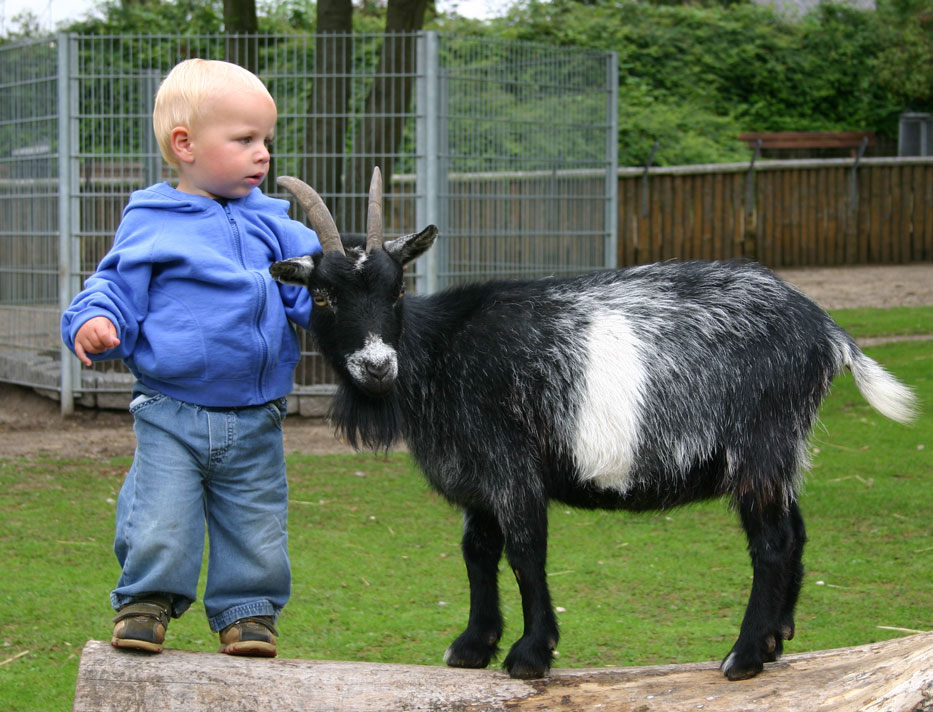 Felix klappar en get i Geografisk Have i Kolding.